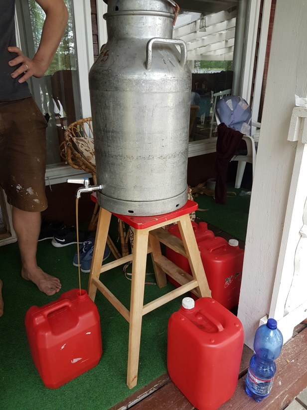 Listasta meidän käytössä ollut pata oli vanha saunapata, ja kuurna perinteinen puuhun koverrettu. Vanha maitotonkka toi hommaan lisää perinteen sävyä.